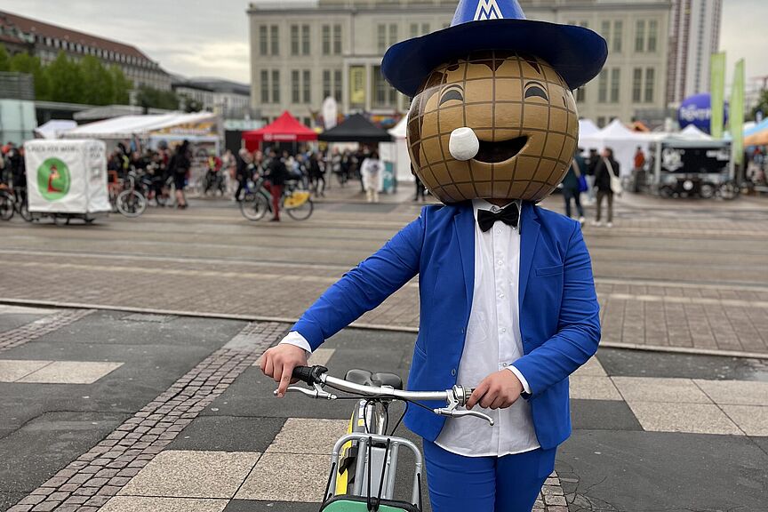 Auch das Maskottchen der Leipziger Messe greift zum Rad. © ADFC NRW / Andreas K. Bittner